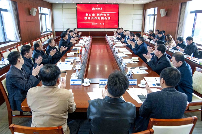 校長郭善利介紹了學校的歷史及發展現狀,重點介紹了我校在服務地方經濟社會發展方面的探索和成績。他表示,煙臺大學是以“煙臺”冠名、由煙威人民集資興建的高校,學校始終堅持立足煙臺、融入煙臺、服務煙臺,把服務區域經濟社會發展作為重要發展戰略,積極與地方政府、企事業單位開展務實高效的交流合作。在龍口經濟社會發展迫切需要的招才引智、技術成果轉化等方面,學校也探索并打造出一些特色與品牌。郭善利誠摯地希望龍口市與學校在戰略決策咨詢、平臺共建共享、科技成果轉化、助力產業發展、人才培養引進以及人才共享共用等方面開展積極探討,推動相關資源整合,促進校地雙方合作共贏。龍口市委副書記、市長呂波表達了對煙臺大學的深切感情,充分肯定了煙臺大學在服務區域經濟社會發展中發揮的重要作用,明確指出煙大在推動煙威地區高等教育事業發展方面功不可沒。隨后,呂波從歷史沿革、地理環境、科技人才、交通運輸、企業概況和產業的發展現狀等方面介紹了龍口市的基本情況。他表示,此次對接會議為煙臺大學和龍口市的全方位交流與合作架起了友誼的橋梁,龍口市委市政府將為煙臺大學各類學習研討活動和產學研項目提供最優的服務、創造最佳的環境、給予最大的支持。