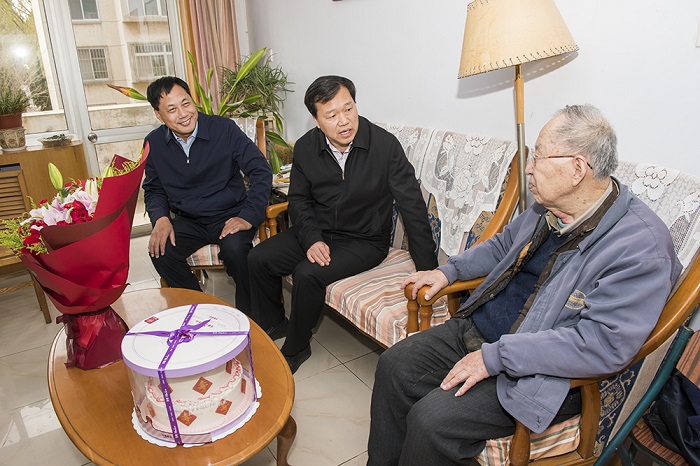 4月19日上午,在我校溫俊峰院士90周歲生日即將到來之際,校長郭善利、黨委副書記張殿臣代表學校師生到家中看望并送上生日祝福。